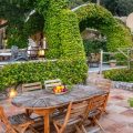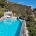 estate is built on a rocky hill descending to the sea. There are several terraces on different levels. The swimming pool is accessed through 3 stairs