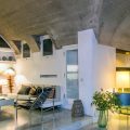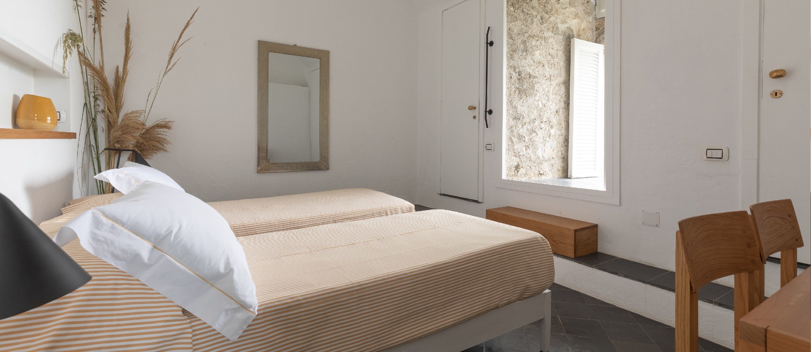 local stone, with an eco-friendly and nature-immersive approach, connecting buildings to the surrounding landscape. Inside, the design, approached with historical research, results in a new style with stone, old terracotta floors and concrete, quality custom-made boards and furnishing. Stone walls and concrete vaults lend a contemporary feel to the interior.
