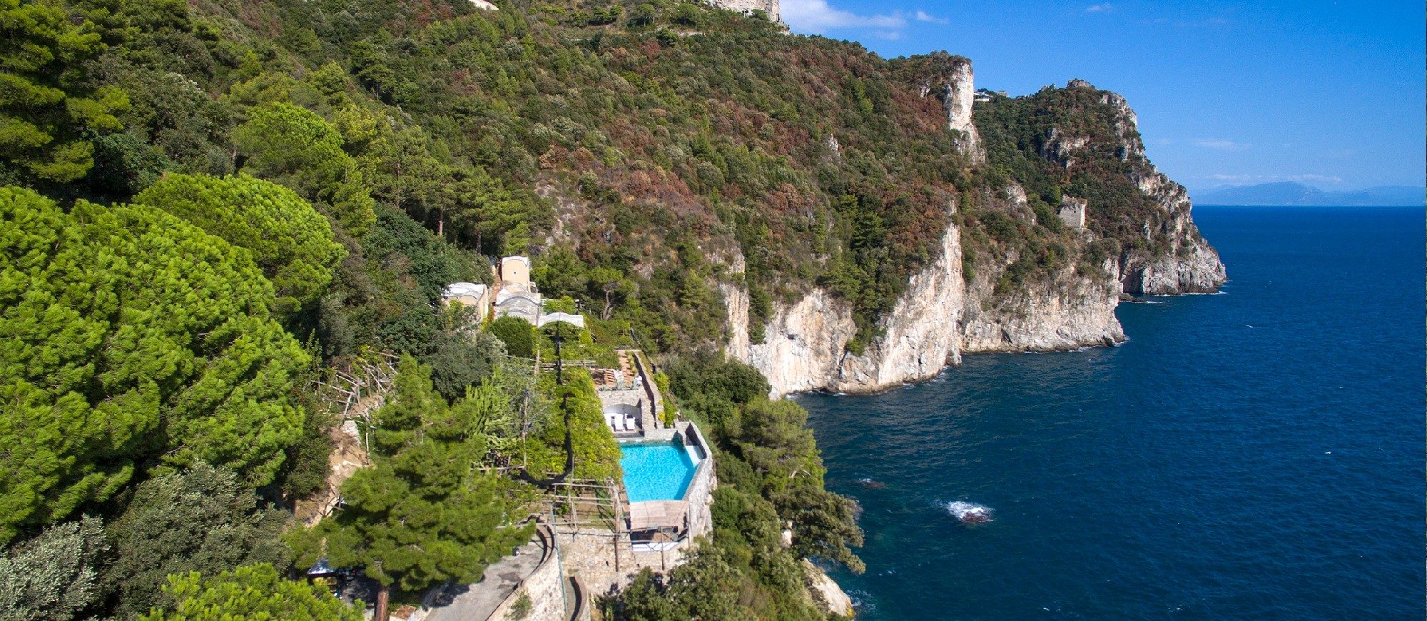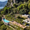 Perched on a cliff just outside of Maiori, this villa features a large solarium and a seawater swimming pool and on the estate are 35,000 square meters of grounds, a vegetable garden and a small animal farm.