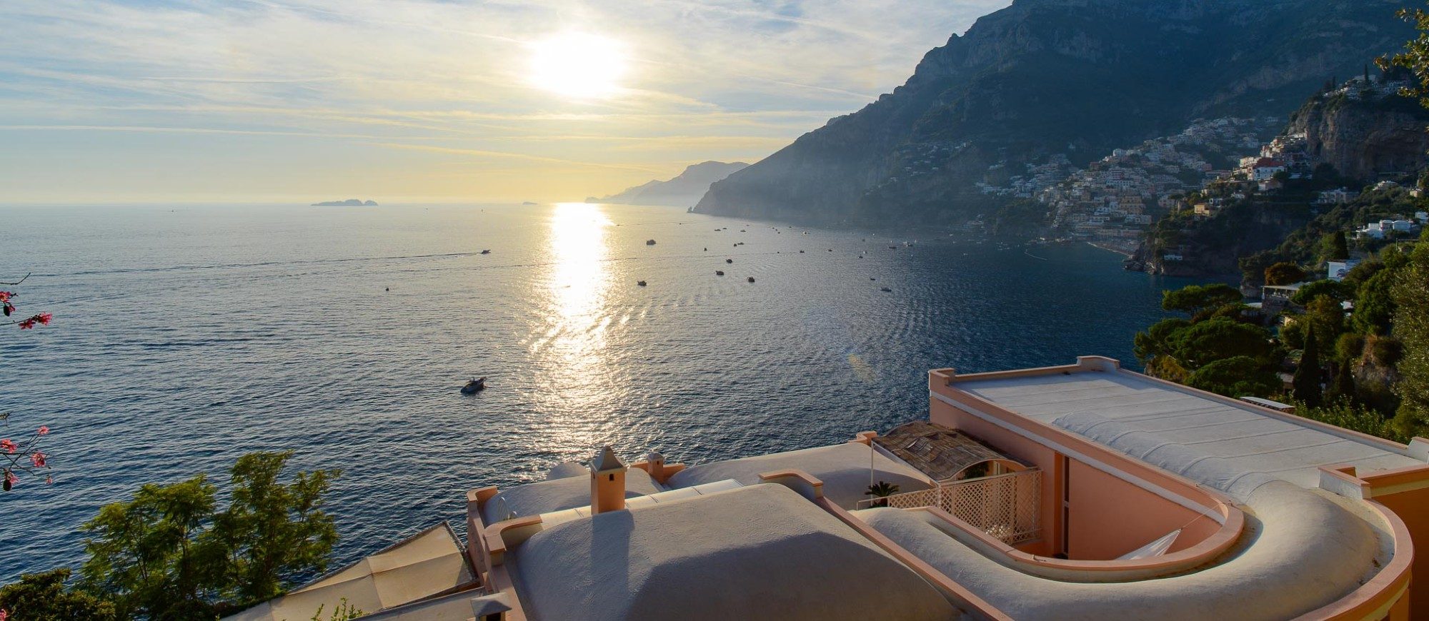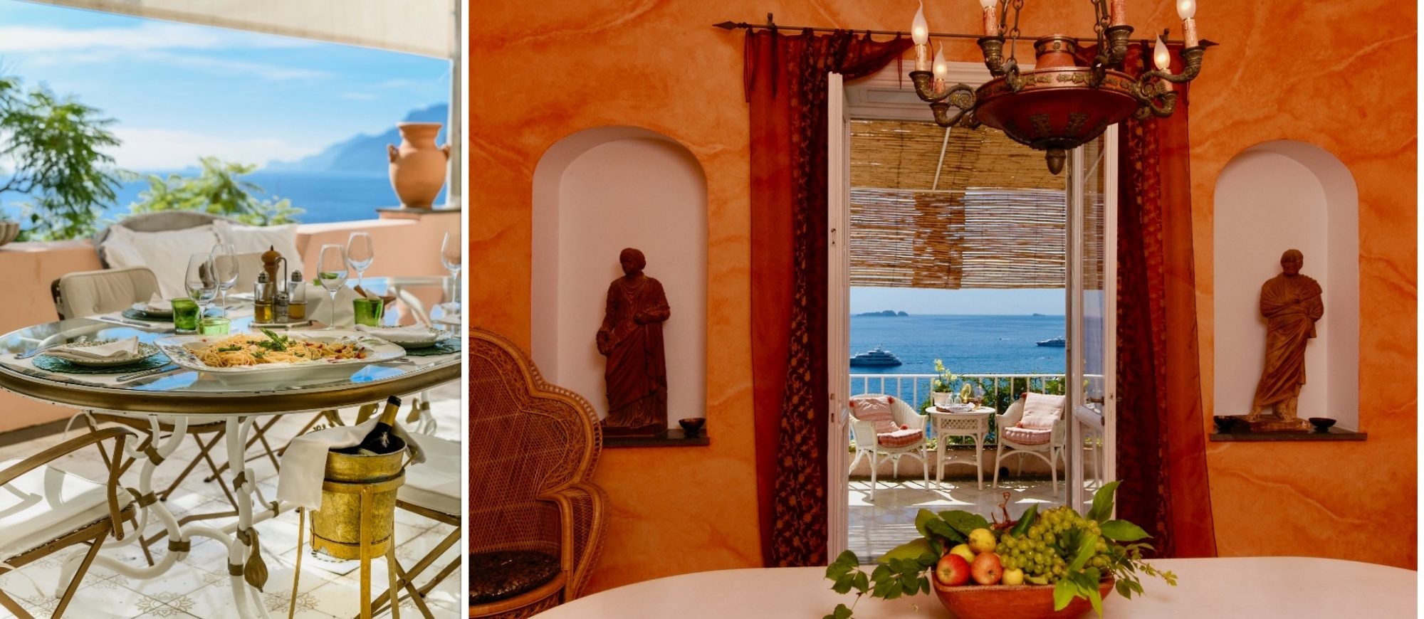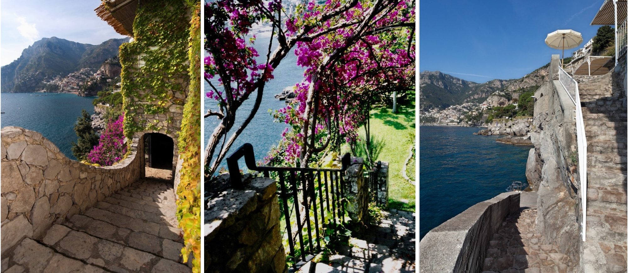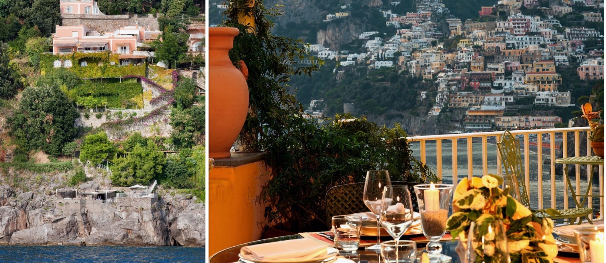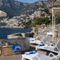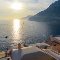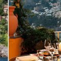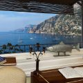 This luxury villa pairs contemporary design with classic regional influences to create a stylish blending between modernity and history, with its epic views of the bay of Positano, surrounded by cliffs, wild scented nature, seaside and a terrace lit at night, with a unique atmosphere.