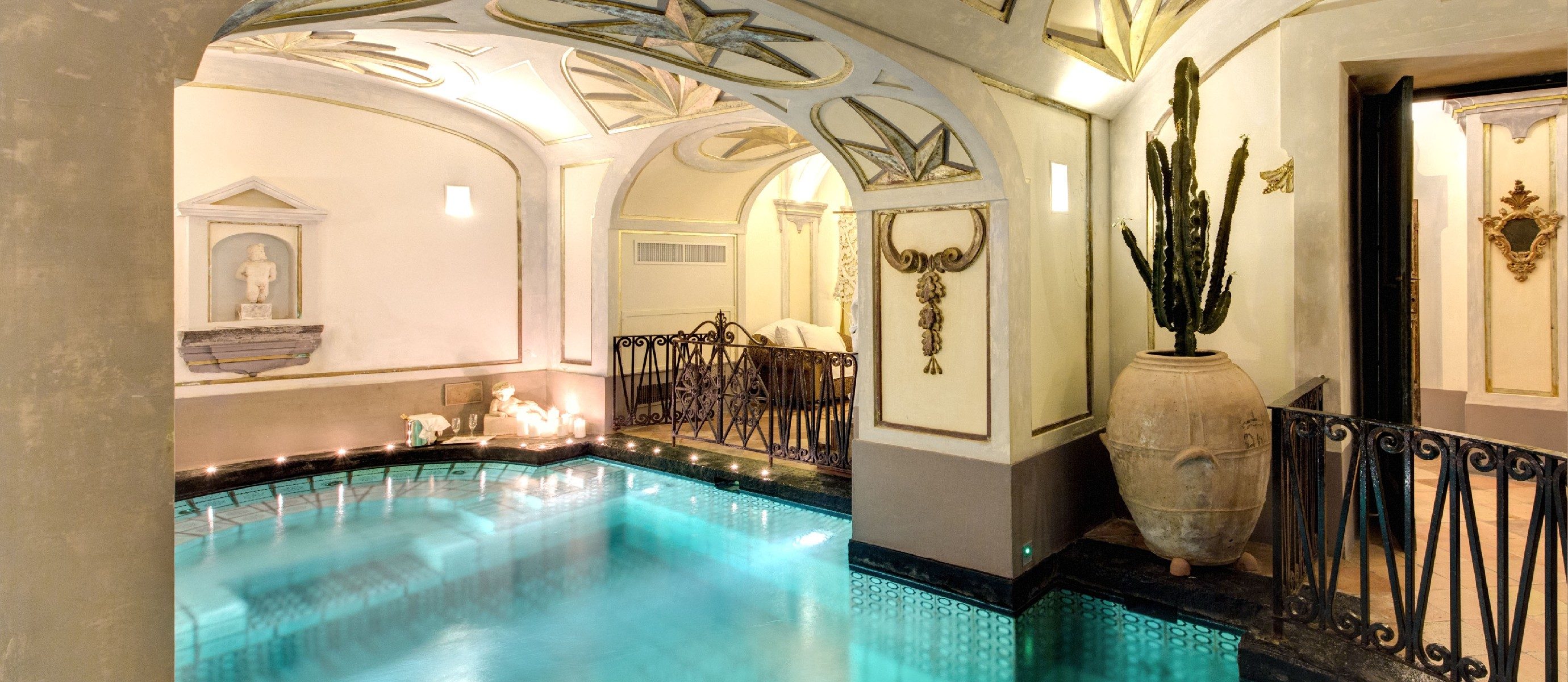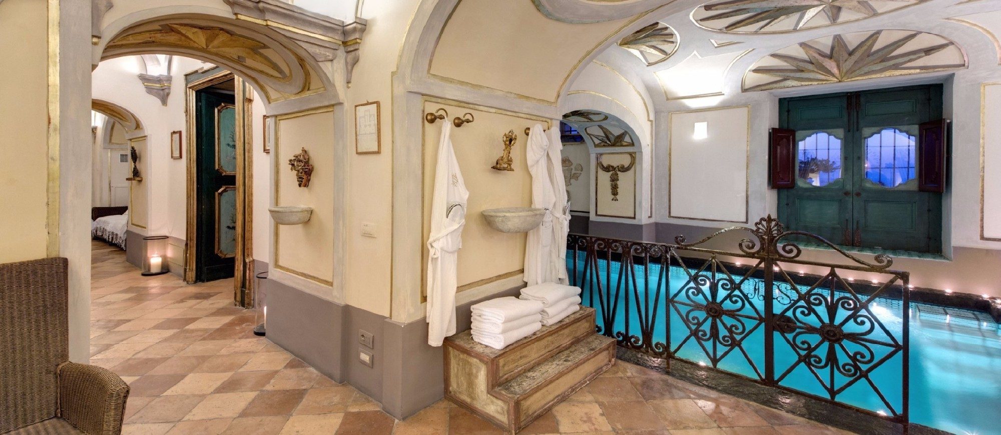 Downstairs, the Salus Per Aquam area has a pool lined with traditional Amalfi Coast majolica tiles and includes massage jets on the walls and seat, a massage waterfall, and a swimming current.