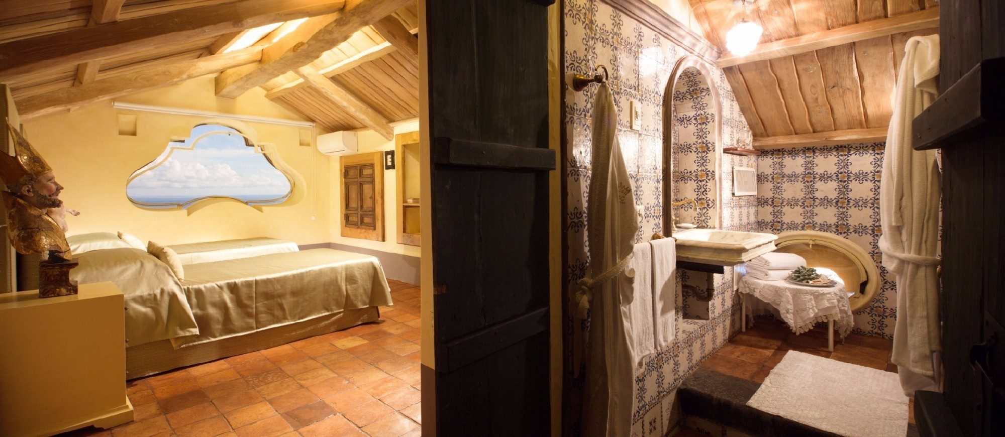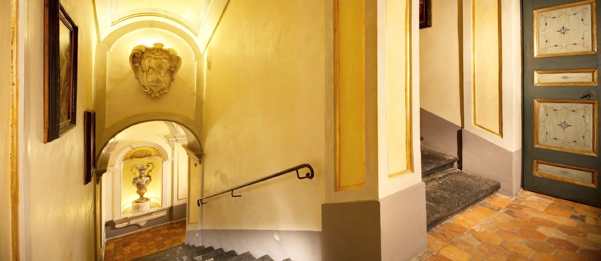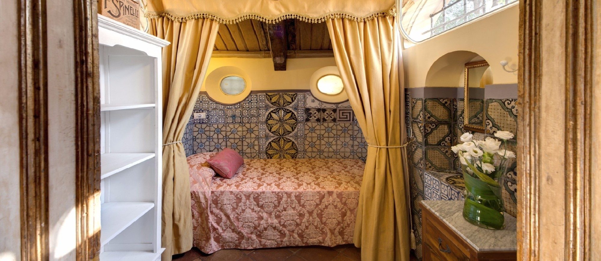 This cosy room decorated in antique majolica tiles is perfect for young guests, personal staff or childminders. The room has its own private bathroom on the landing.
