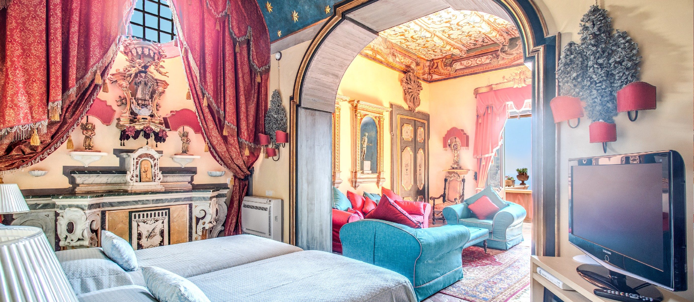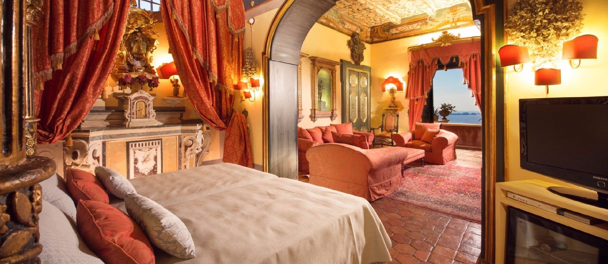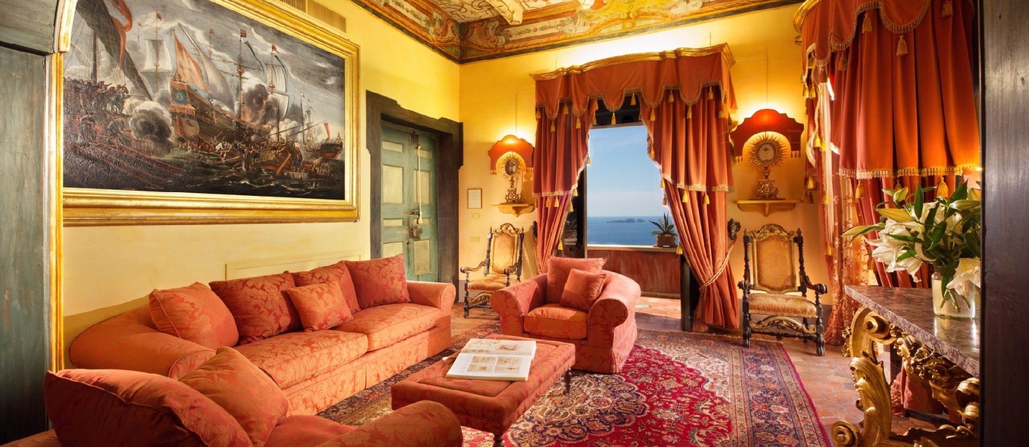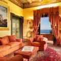 This suite is decorated in keeping with the villa’s overall Baroque style with frescoed ceilings and a private bathroom decorated with antique majolica tiles. The terrace overlooks the sea and the Chiesa Madre.