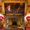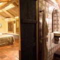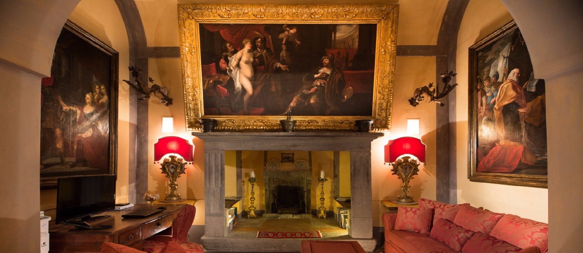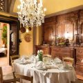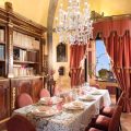 The living and dining room is divided into two separate areas; a dining area with a Tuscan oak dining table encircled by a bookshelf, a Neapolitan Rococo mirror and a collection of antique paintings. A special feature of the living room is its enormous double fireplace with hearthside benches inside the first stone frame.