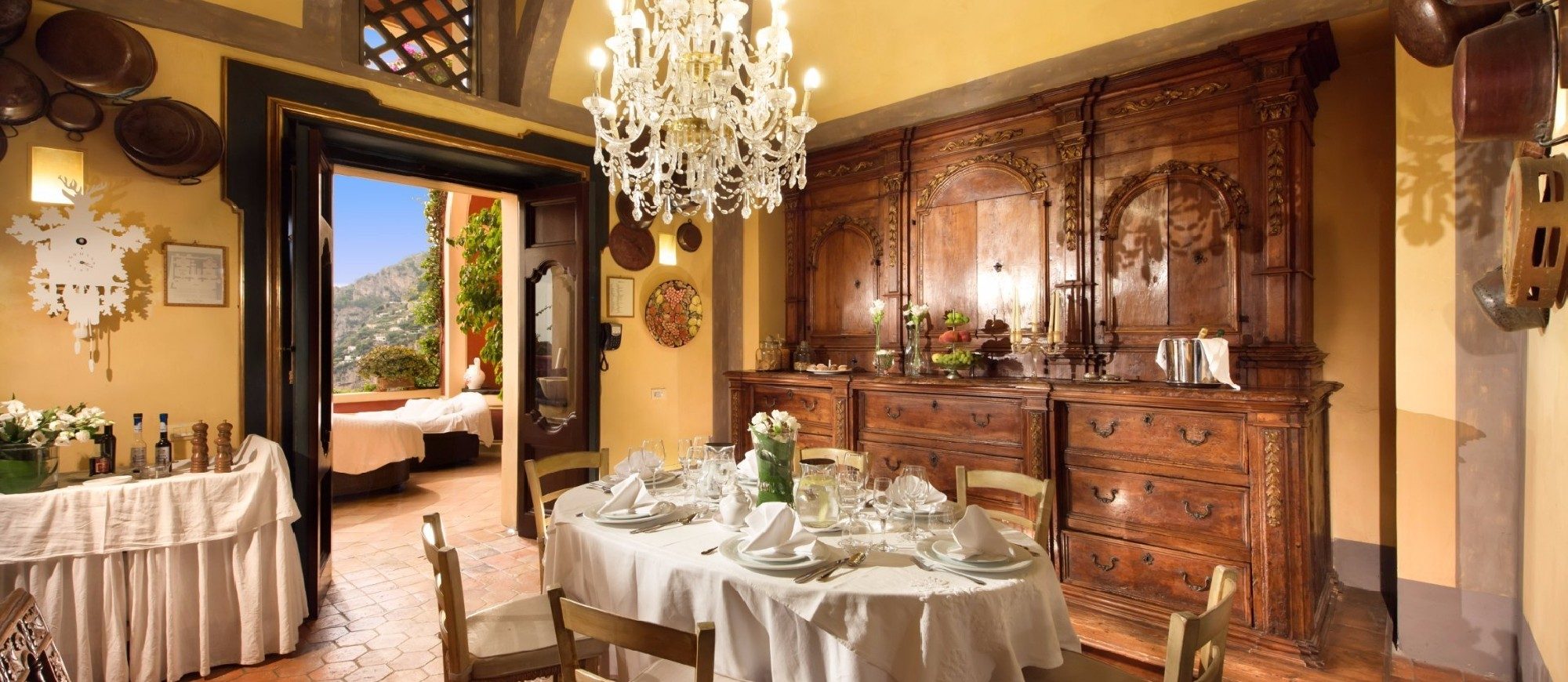Step through the gates into the private internal courtyard, lined with giant terracotta vases and hand-painted majolica tiles. Continue inside to the ground floor living room, dining room, kitchen and grand staircase leading down to the spa or the bedrooms above.