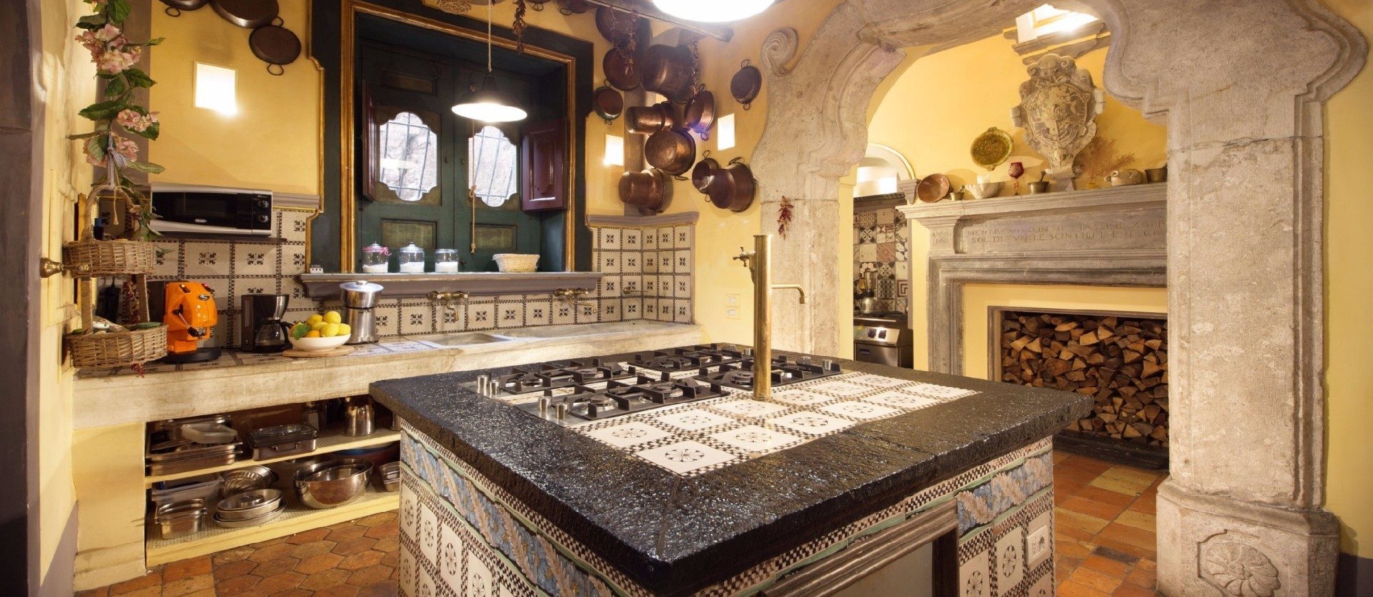 The arcadian, antique kitchen has high end, modern appliances hidden between the stone archways, marble sinks and fireplace. The enormous wooden cabinet dates back to the Baroque period, and the two bread and pizza ovens are built directly into the thick stone walls decorated with antique majolica tiles.