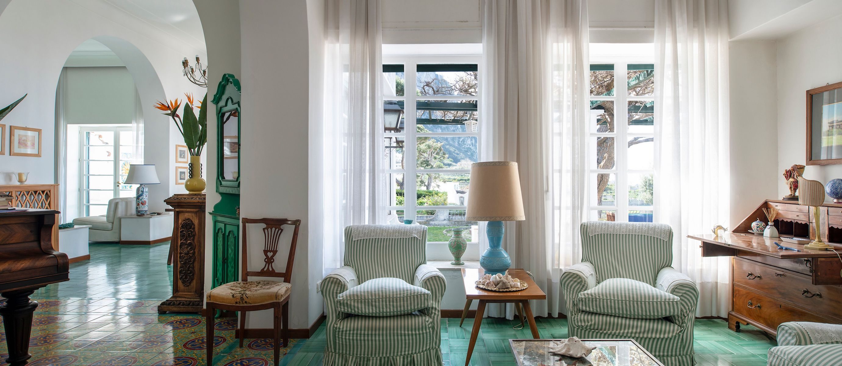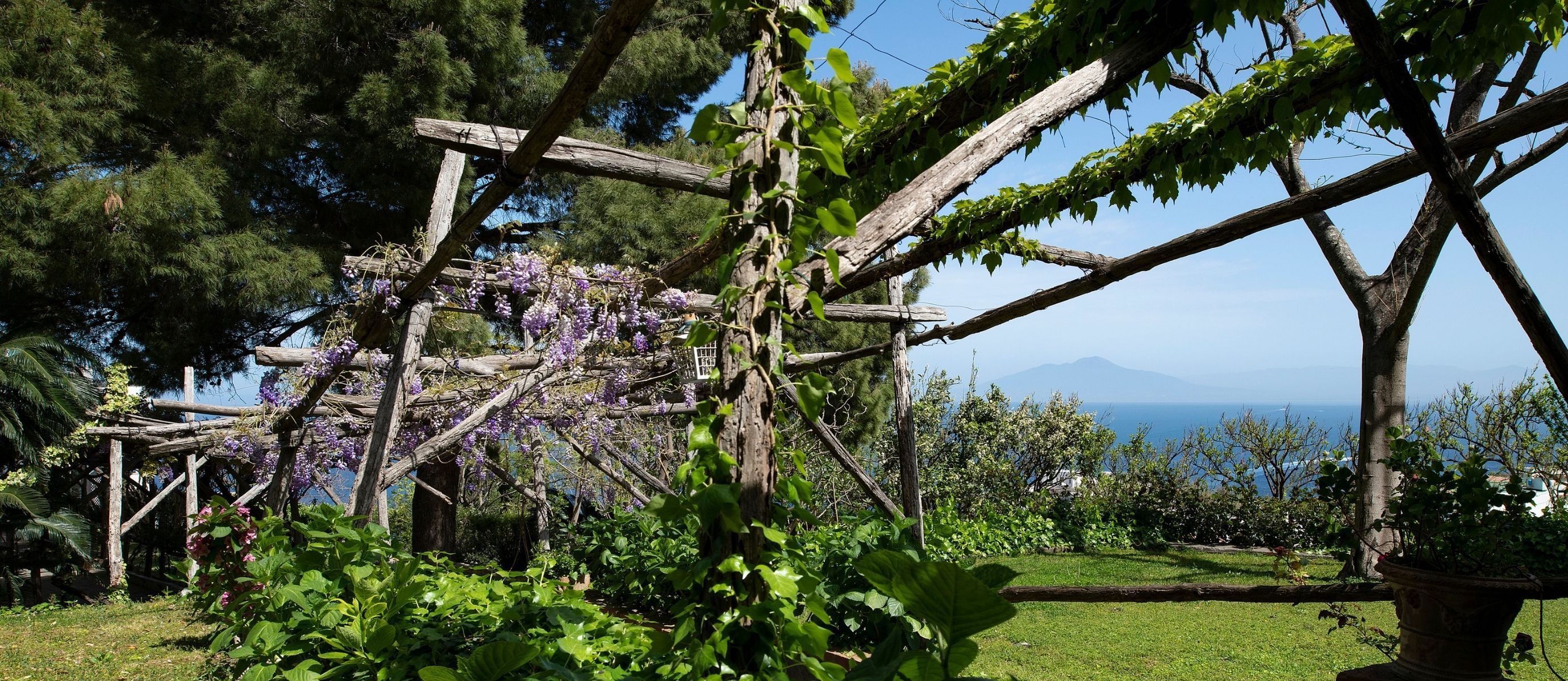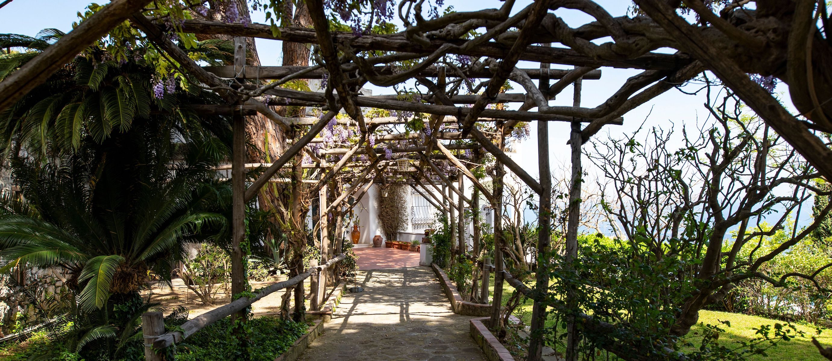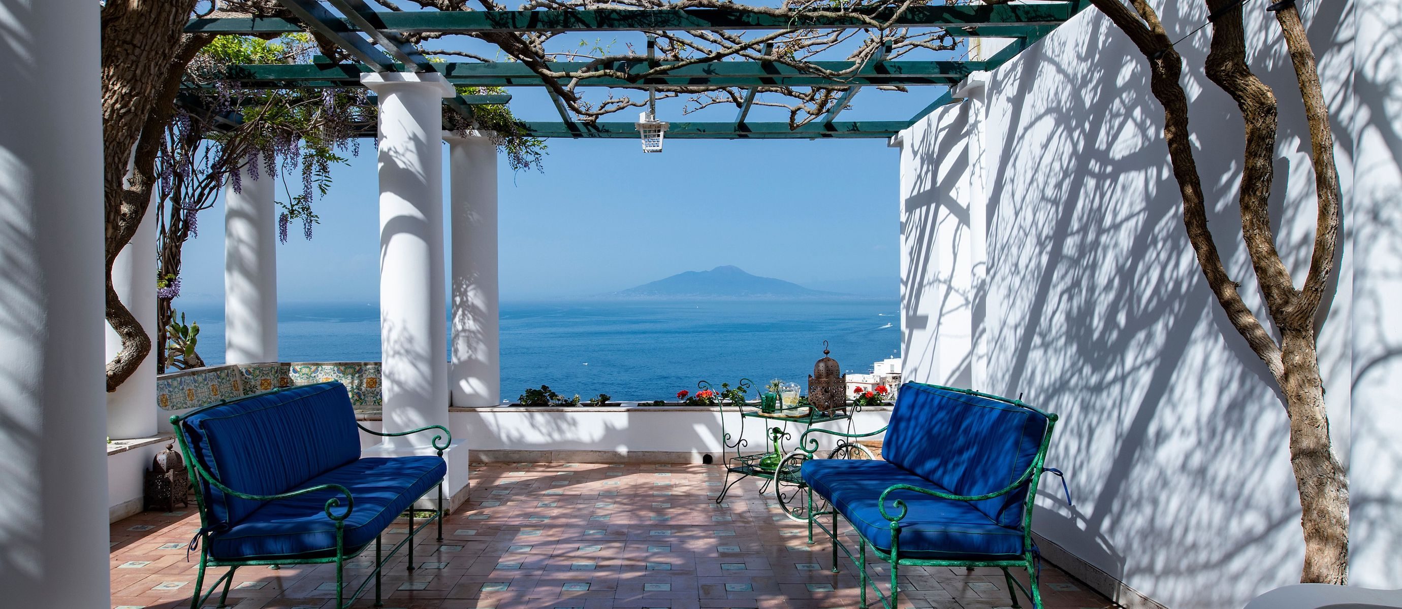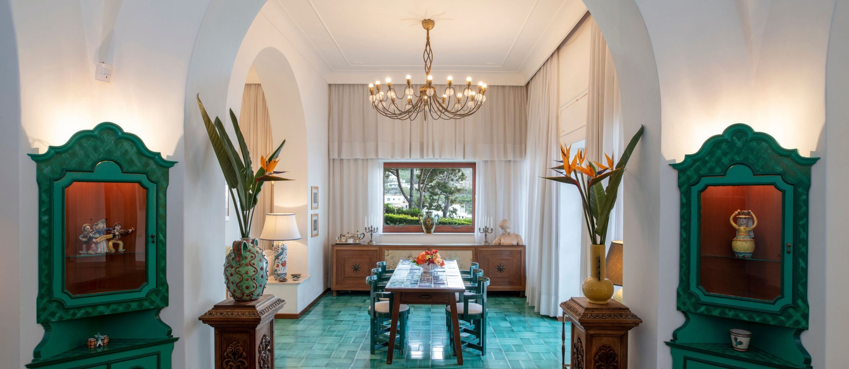 The entrance to the villa is accessed through a beautiful long pergola avenue with climbing plants that leads to the spacious living rooms. The lounges are divided into various areas: reading lounge, antique fireplace lounge, dining room, lounge with second fireplace. All rooms have large window and overlook the two patios and the breathtaking view of the Gulf of Naples and Vesuvius. Enjoy meals, from breakfast to dinner, under the splendid colonnade while taking in the breathtaking view of the garden and Marina Grande.