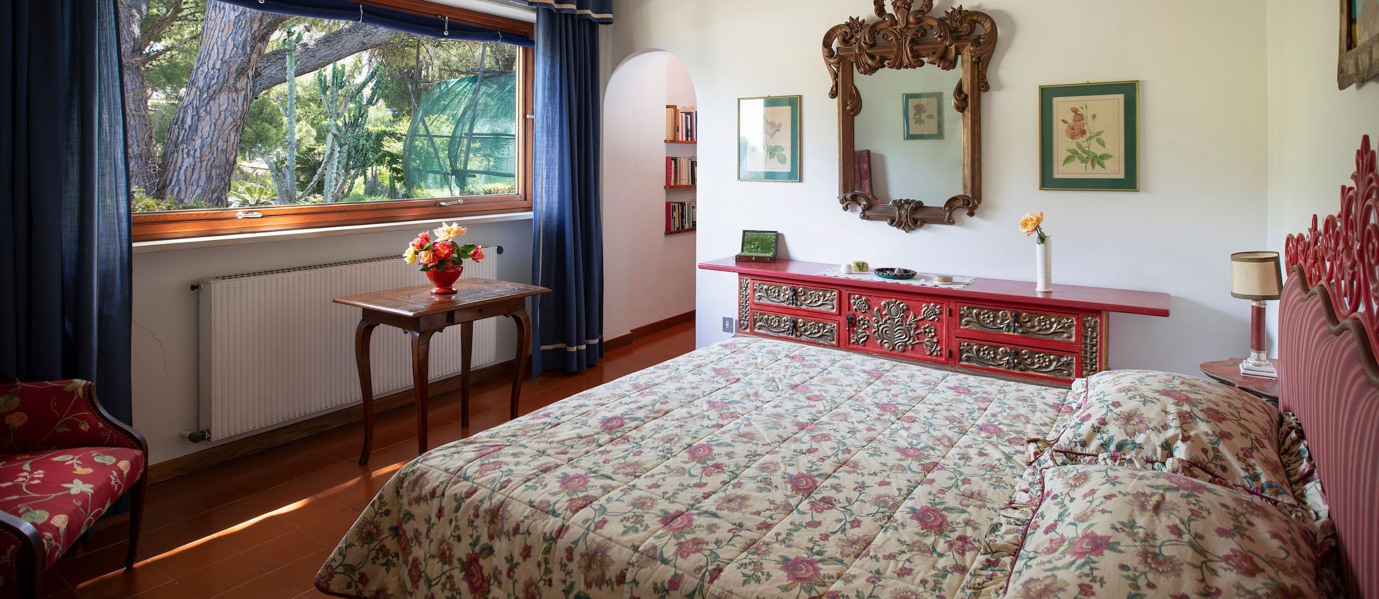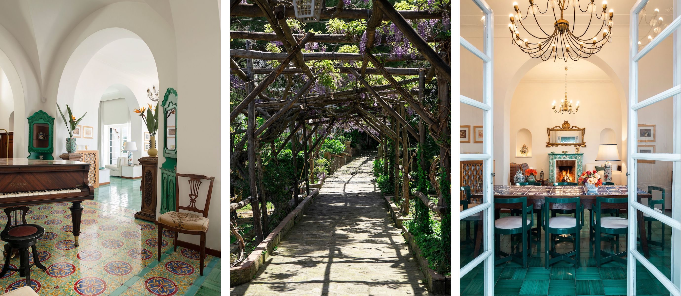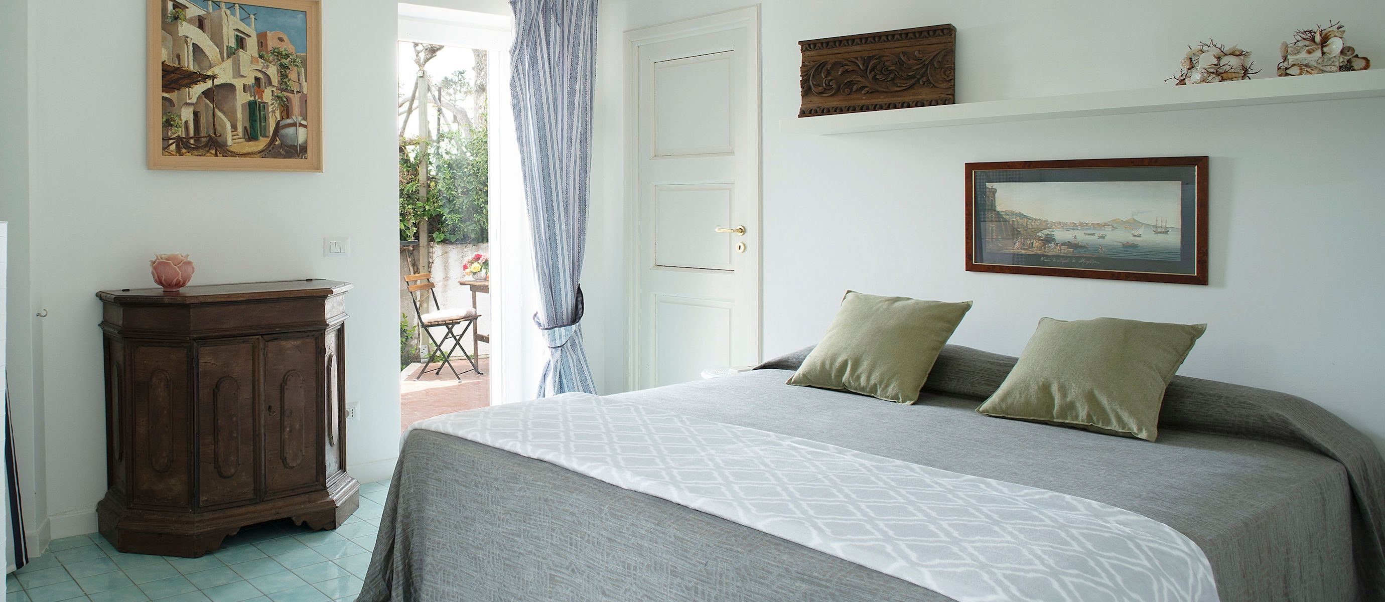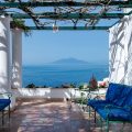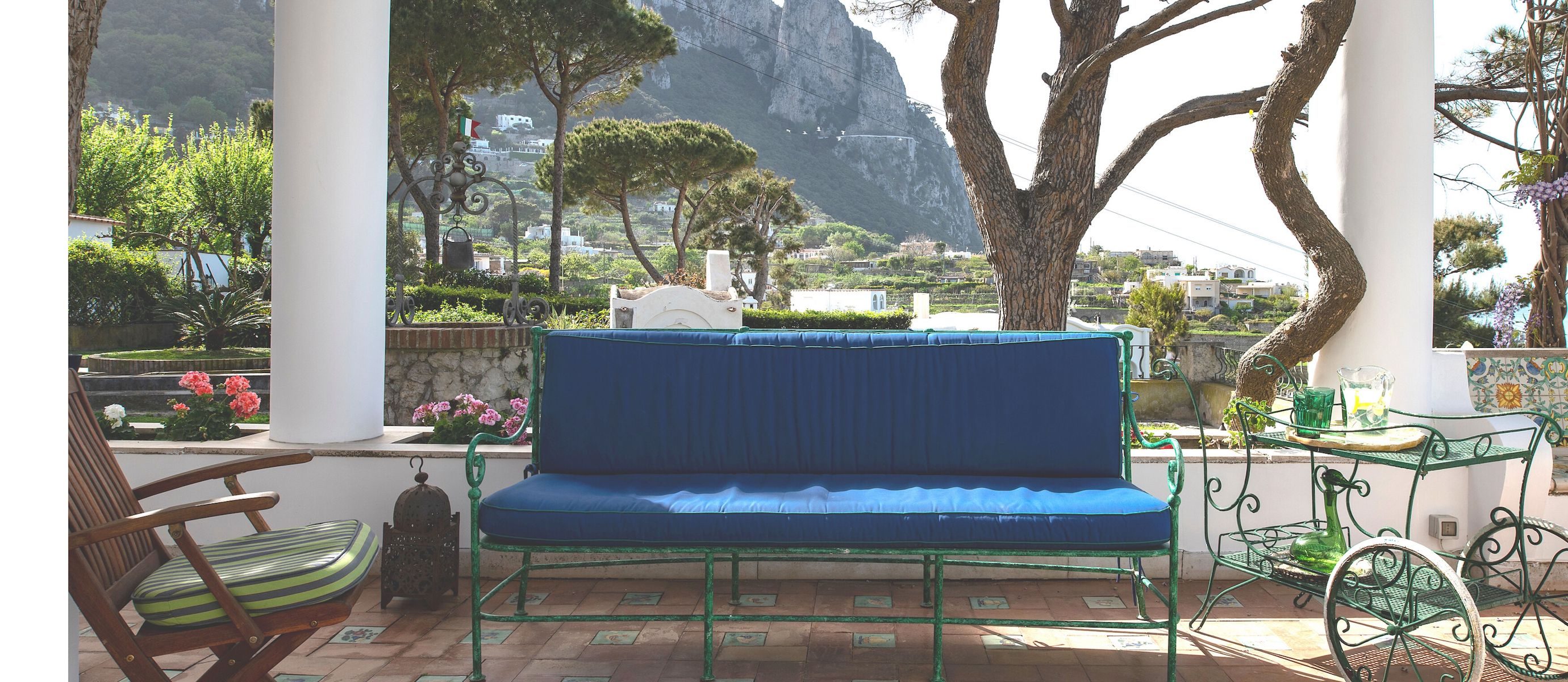 The entrance to the villa is accessed through a beautiful long pergola avenue with climbing plants that leads to the spacious living rooms. The lounges are divided into various areas: reading lounge, antique fireplace lounge, dining room, lounge with second fireplace. All rooms have large window and overlook the two patios and the breathtaking view of the Gulf of Naples and Vesuvius. Enjoy meals, from breakfast to dinner, under the splendid colonnade while taking in the breathtaking view of the garden and Marina Grande.
