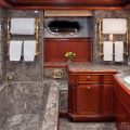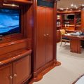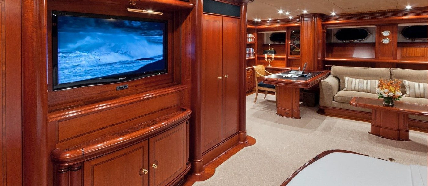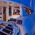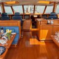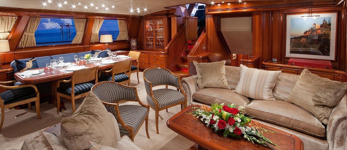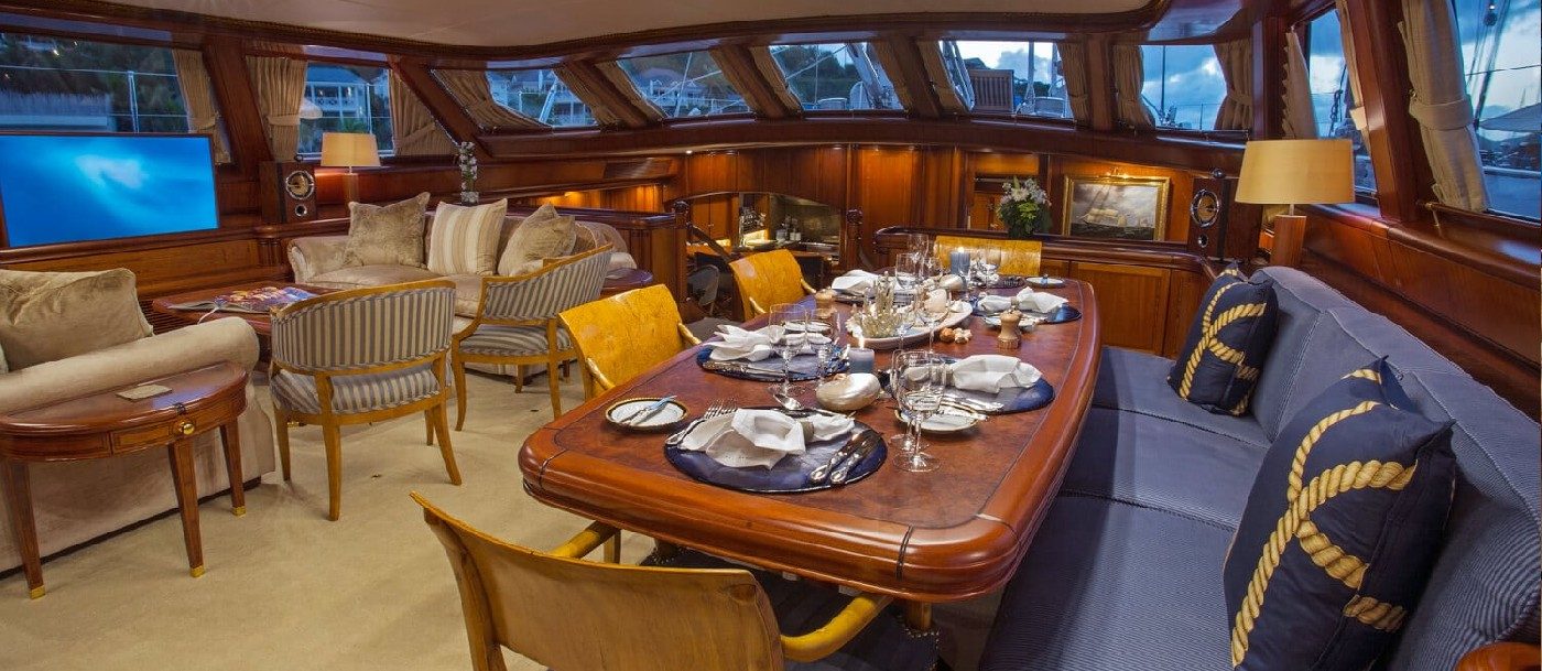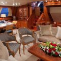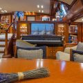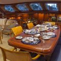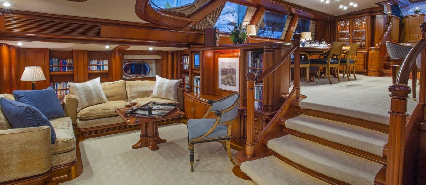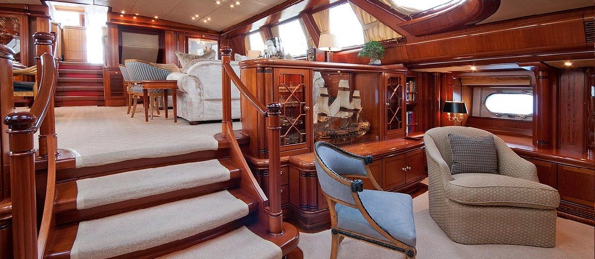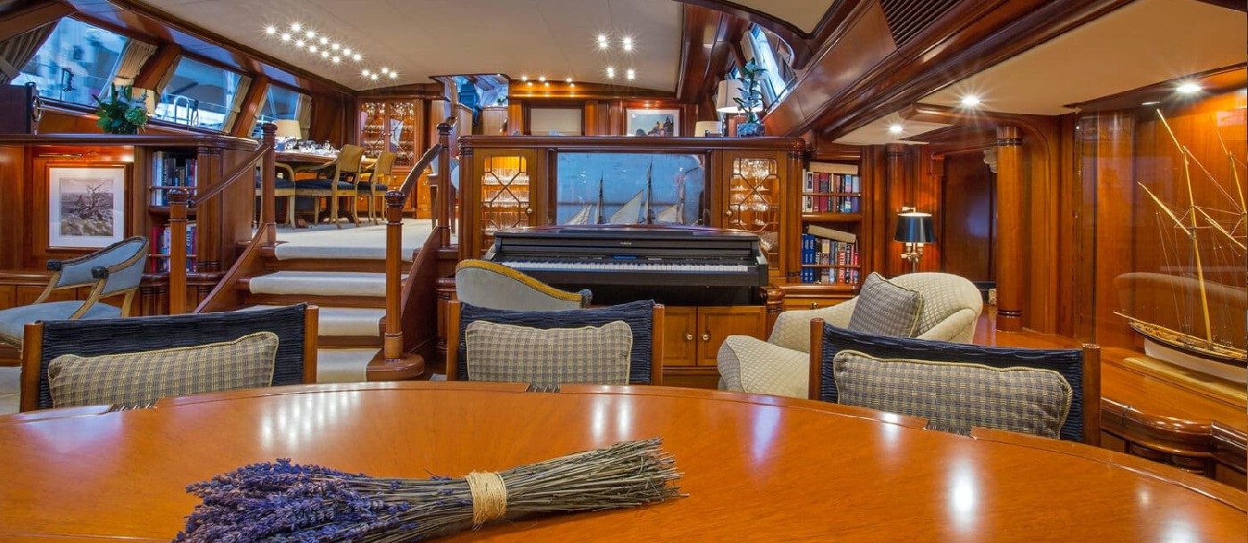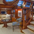 The main saloon is split level, allowing for a formal lounge and dining area in the upper portion, with steps leading to a more intimate ‘snug’ and piano lounge. A sweep of windows around the superstructure floods the interior with natural light.