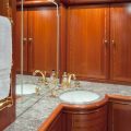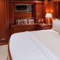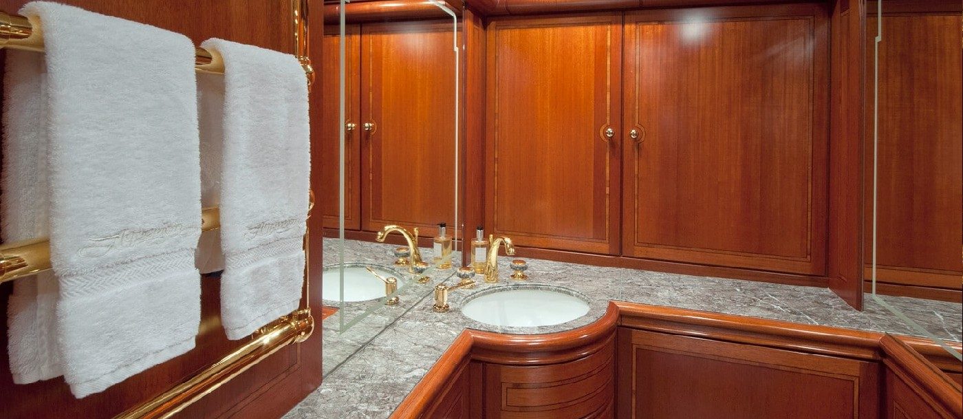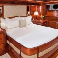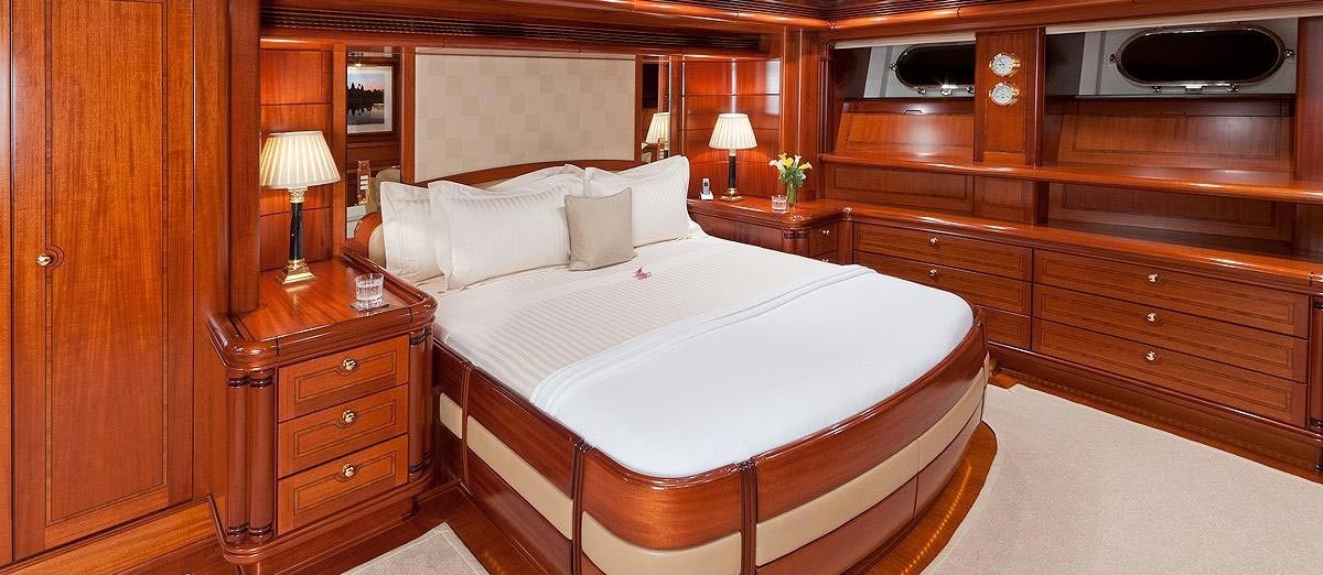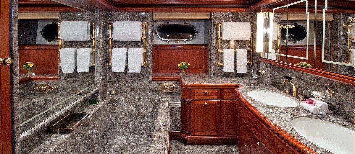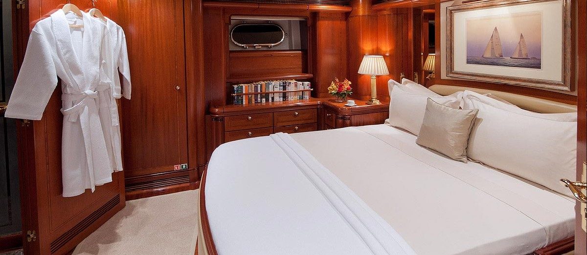Her interior layout allows for six guests to be accommodated in three spacious cabins, with the configuration comprising two doubles and a twin. All of the accommodation is en suite and the full-beam master cabin boasts an impressive marble bath.