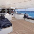 There are cushioned sun pads for lounging and sunbathing aft of the helm stations, where guests can relax in safety whilst the yacht is underway, as well as multiple loungers and beanbags that can be positioned as desired.